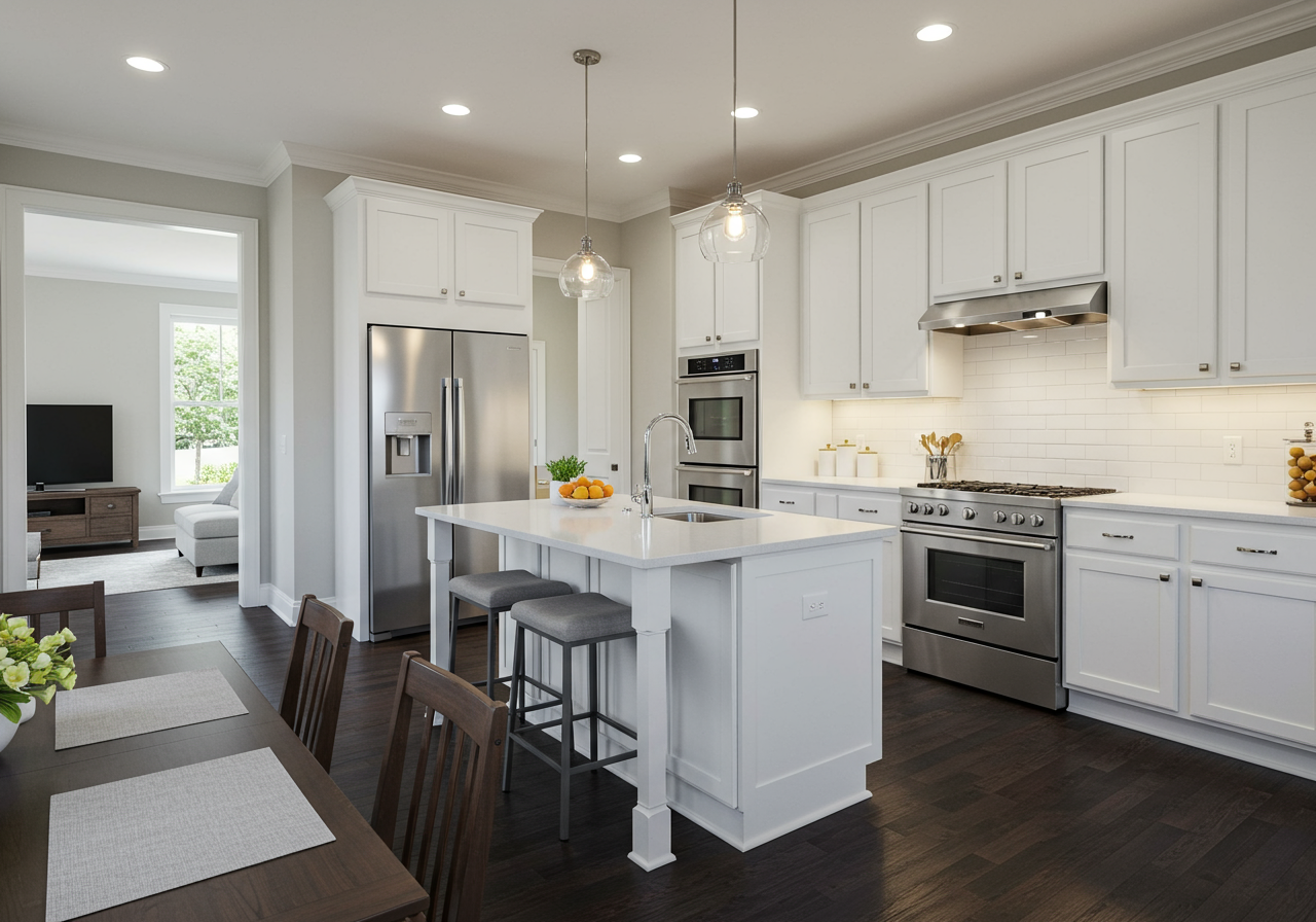 The main floor boasts African Mahogany hardwood floors that perfectly accent the white kitchen cabinets and slate gray appliances.